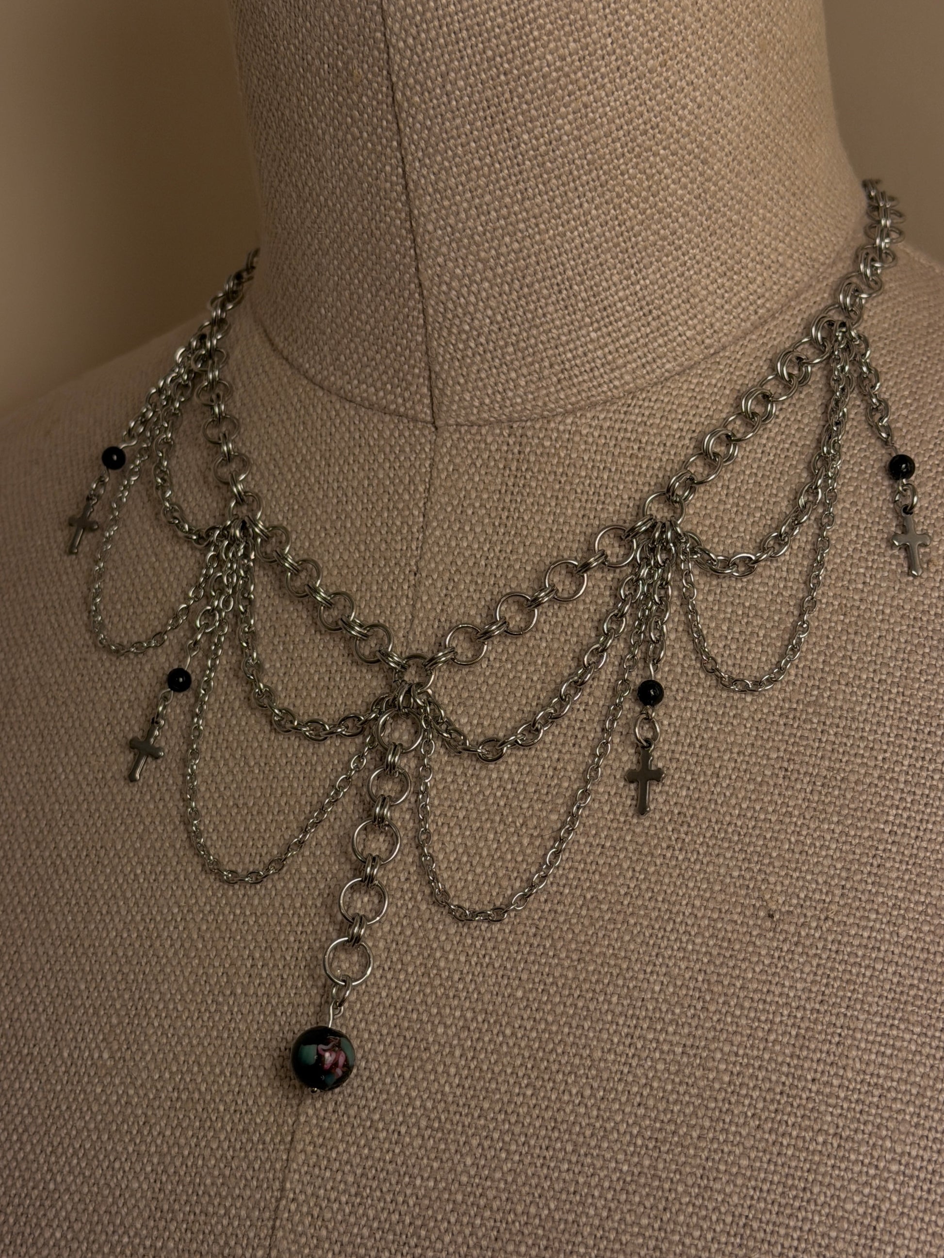 The DAHLIA necklace is a 100% stainless steel and glass bead necklace with cross charms. Beautiful and dangerous, this necklace is sure to turn heads. The necklace is a one off piece and has an adjustable chain making it range from 45-50cm long.