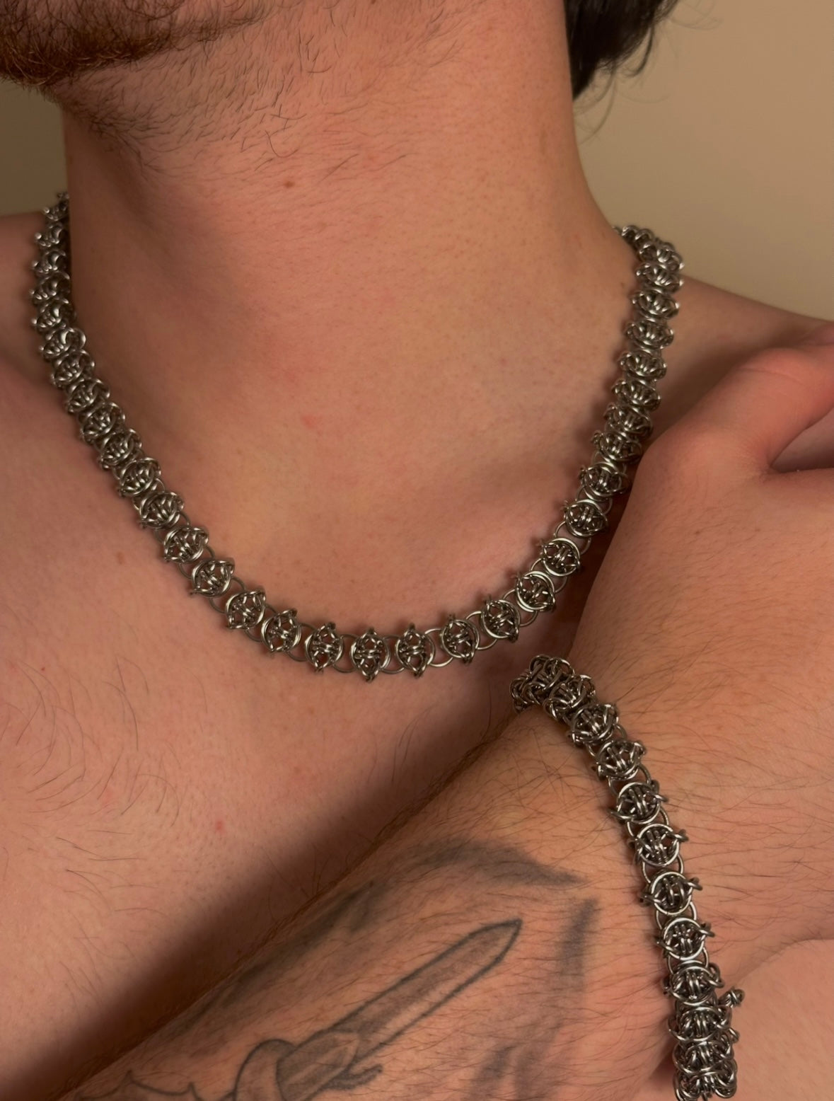 The ODIN’S PROTECTION bracelet utilises the weave “Odin’s eye” to create a barbed wire effect. The name comes from Odin sacrificing his eye to gain knowledge and wisdom and the protective symbolism of barbed wire. The chain is made of 100% stainless steel and has a lobster clasp. It comes in 3x lengths: 18cm, 20cm, and 22cm (or 7in, 7.9in, and 8.7in).