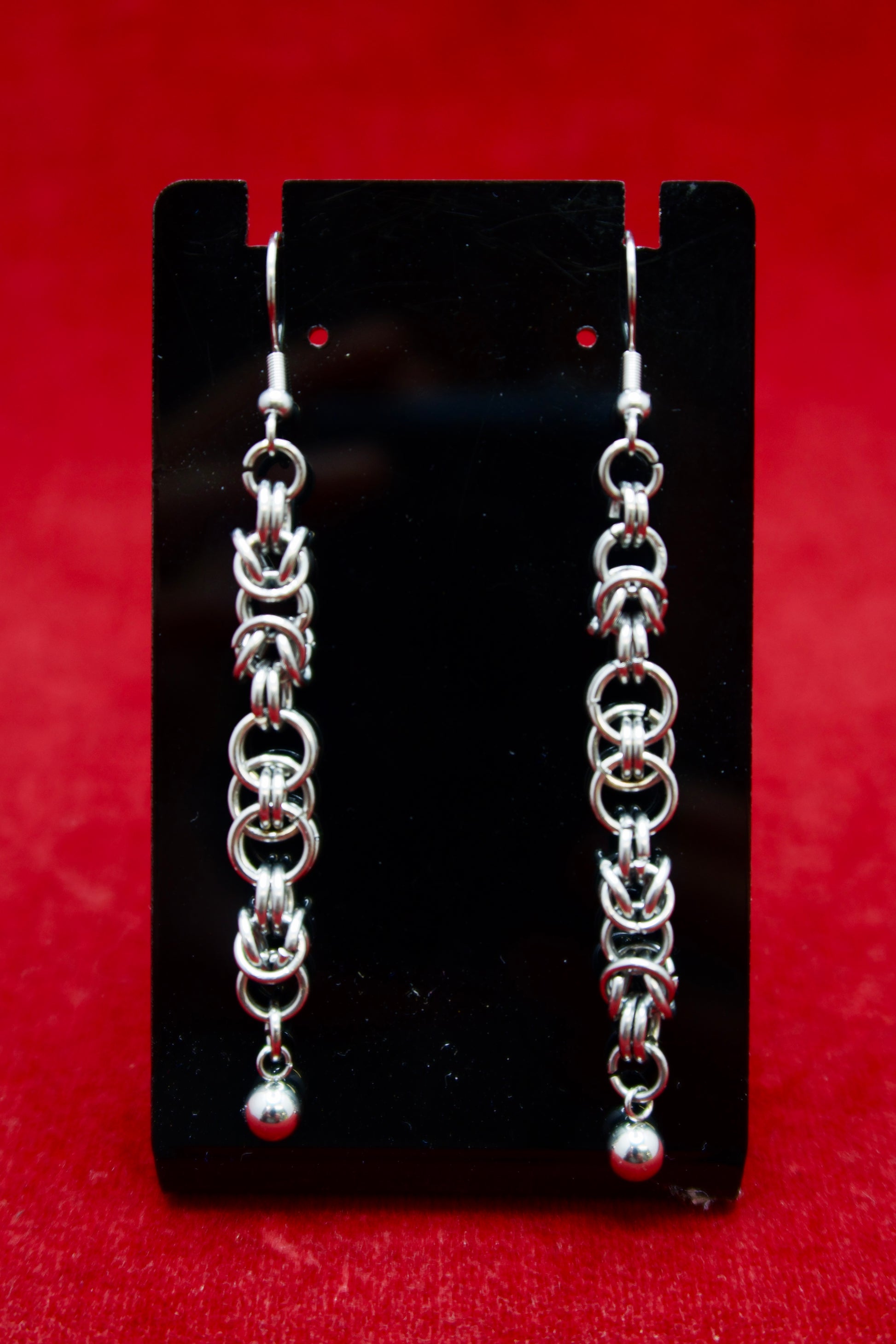 Ligatus, meaning 'to bind', is a set of earrings crafted using a helm weave connected on both sides by byzantine weaves. The earrings are alisghtly asymmetric, with the byzantine weave being slightly different on each. Made out of 100% stainless steel, these earrings are approximately 6.5cm long (vary slightly in length) and have hook backs.