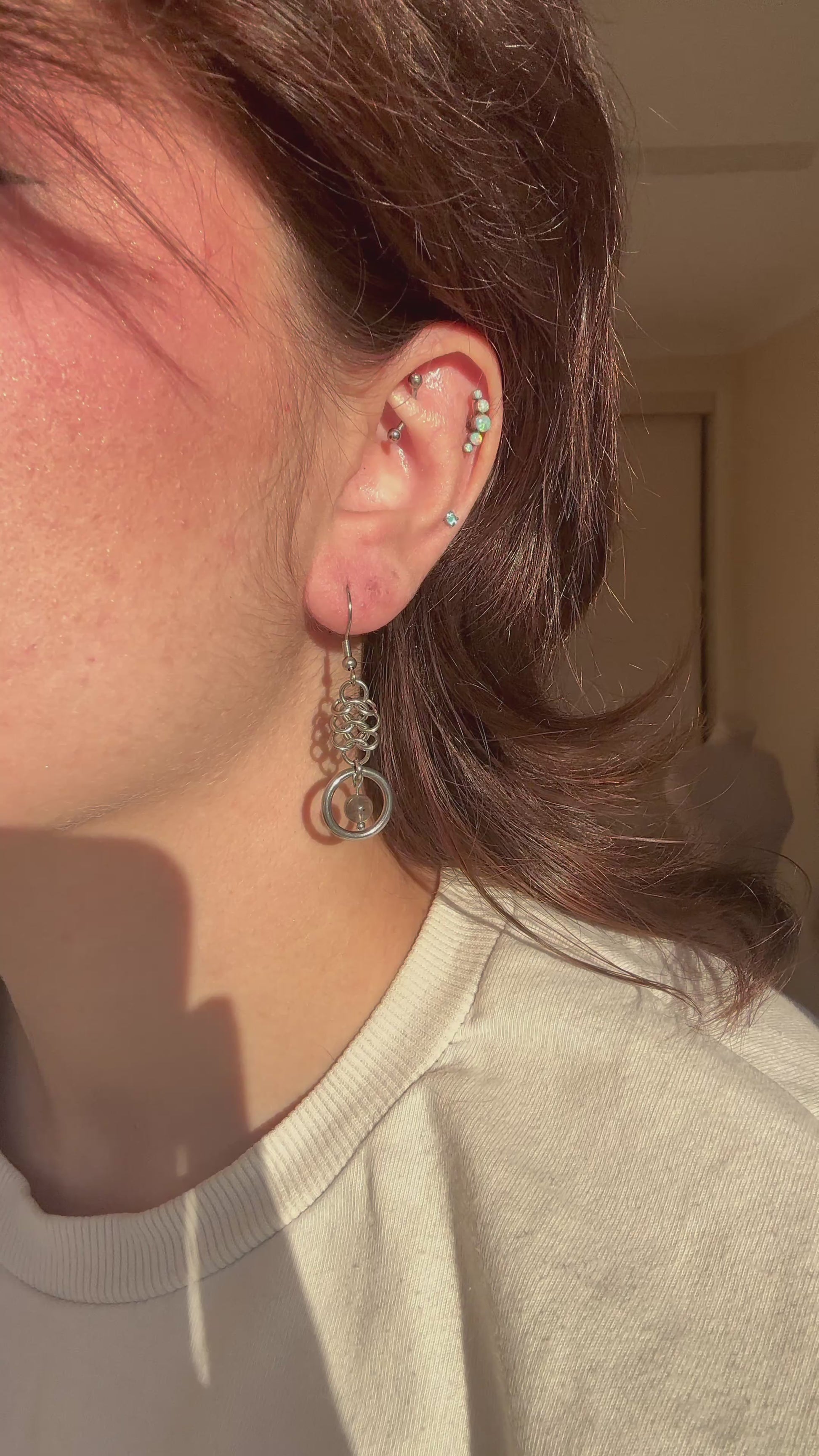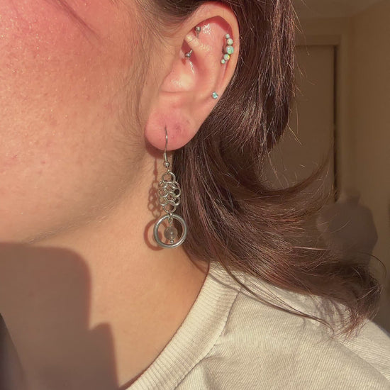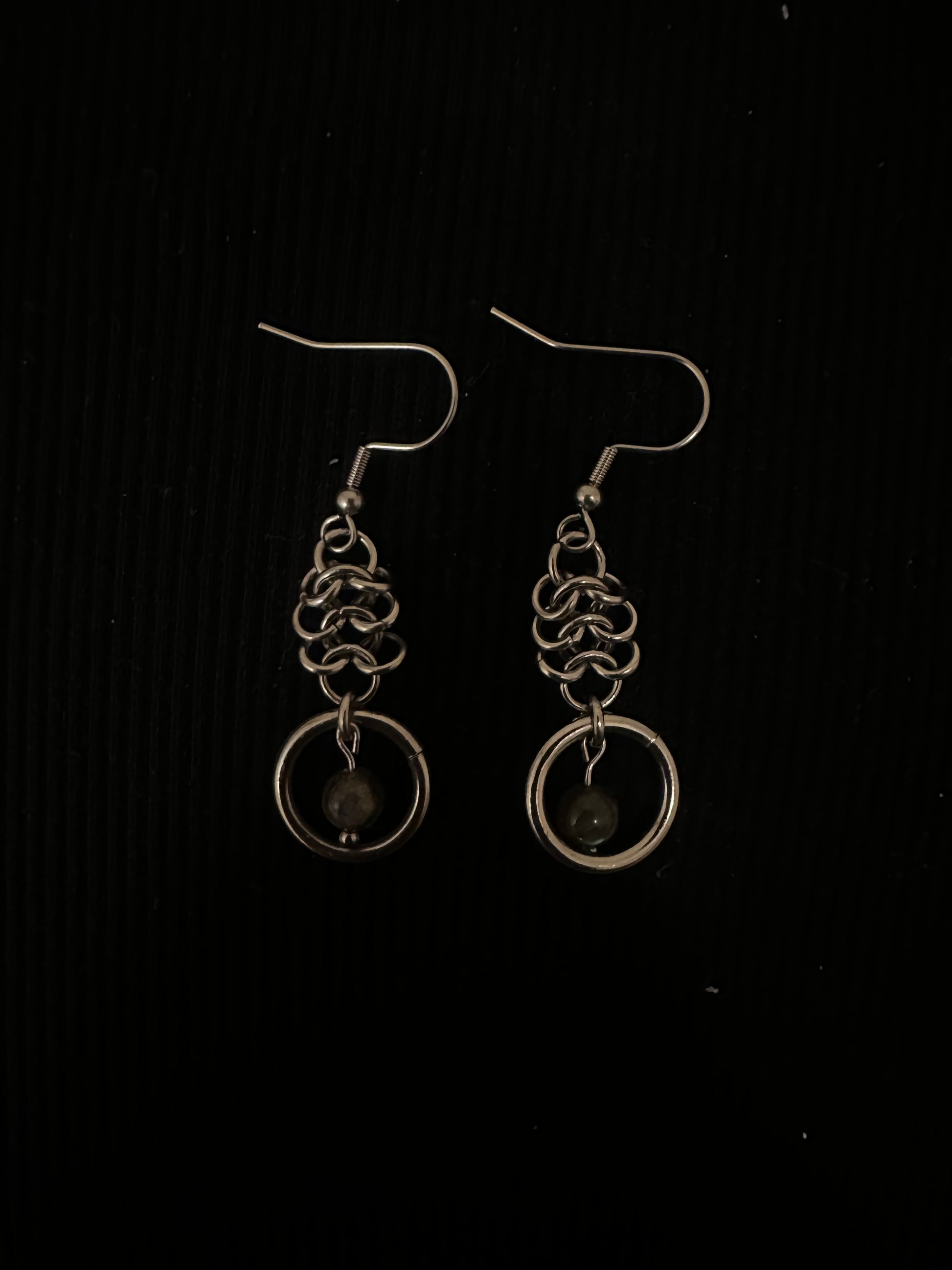 Introducing the NOCTURNE earrings. The name of these earrings is really cool, just like they are. They're minimal and perfect for everyday wear, but have a labradorite stone that glints in the light for just a bit of extra charm. The earrings are made using 100% stainless steel and a genuine labradorite stone. They are approximately 3.4cm long.